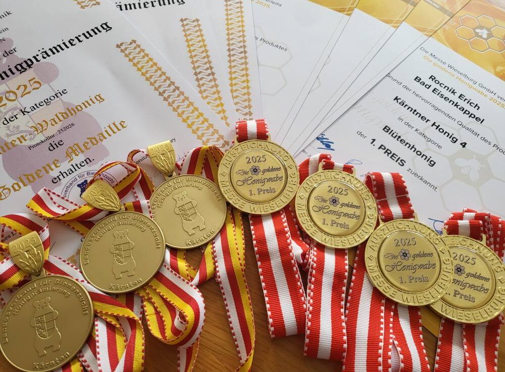 Bei der diesjährigen Honigprämierung auf der Messe Wieselburg konnten wir mit Stolz unsere Qualität unter Beweis stellen: 6 Goldmedaillen für unsere Honige! Diese Auszeichnungen sind ein klares Zeichen für unsere konsequente Arbeit, die Leidenschaft und unsere Liebe zur Natur.