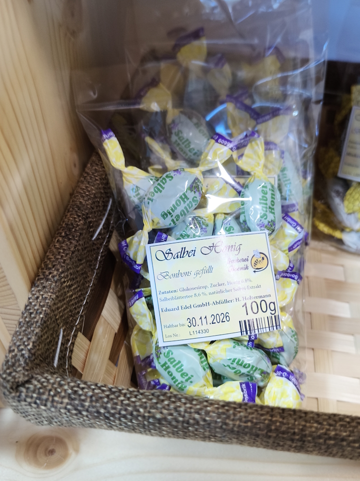 Glukosesirup, Zucker, Honig 6,8%, Salbeiblättertee 8,6%, natürlicher Salbei-Extrakt