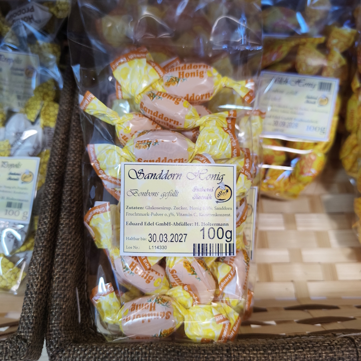 Glukosesirup, Zucker, Honig 8,6%, Sanddorn Fruchtmark-Pulver 0,3%, Vitamin C, Karottenkonzentrat